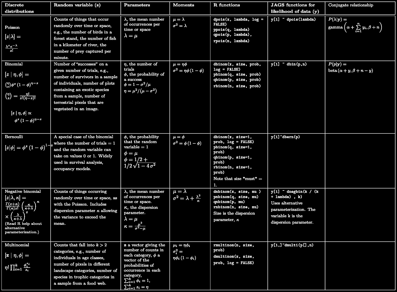 In addition to continuous random variables, there are also discrete random variables, which are typically used to describe counts. Some counts, such as population, can take on any integer greater than or equal to 0. A Poisson or negative binomial distribution can be used to model these variables. Other counts, for example the number of visits out of a total of \(N\) in which an animal was observed, have a maximum value. In these cases a binomial distribution can be used which can take on any number between and included 0 and \(N\) . The last common discrete variable in ecology is a binary one, in which the response can be either 0 or 1 (e.g., presence of a species within a plot). For these variables, the Bernoulli distribution can be used.