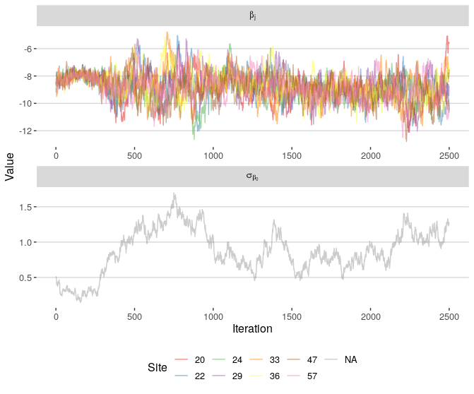 In the lower panel of the funnel traces, you can see that \(\sigma_{\beta_0}\) drifts into smaller values and gets a bit “stuck”. Basically, the sampler can’t efficiently explore that parameter space. While stuck, the slopes \(\beta_j\) compress / squish together, thereby creating the problematic funnel we saw in the first figure.